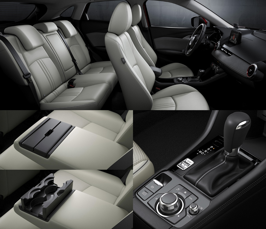 Вперше в старших версиях на CX-3 доступні полалестью кожание сиденья (они можуть бути белими або чйорними). Переработани передние кресла, получившие високоплотную уретаалевую пену. На втором ряду появился подлокотник с подстаканниками.