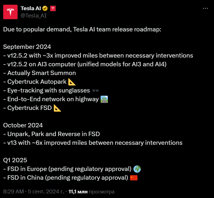 У середу Tesla оголосила про нові оновлення, які можуть змінити ситуацію. На обліковому записі Tesla AI X була оприлюднена дорожня карта з планами на найближчі випуски функцій. Відповідно до цих планів, функція «Реверс у FSD» буде додана вже в жовтні цього року.