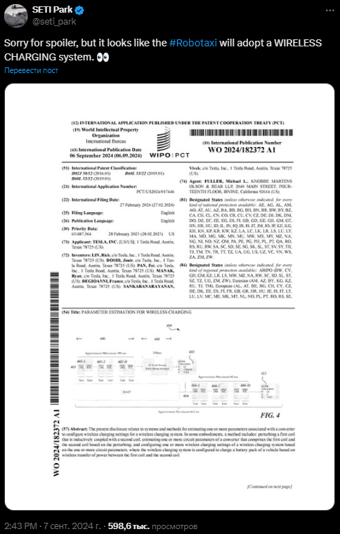 — 10.09.2024 / 21:07Tesla, здається, наближається до впровадження бездротової зарядки для своїх електромобілів. Нещодавно опубліковані патенти, які були виявлені та розповсюджені користувачем X (колишнім Twitter) під псевдонімом SETI Park, викликали значний інтерес у соціальних мережах.
