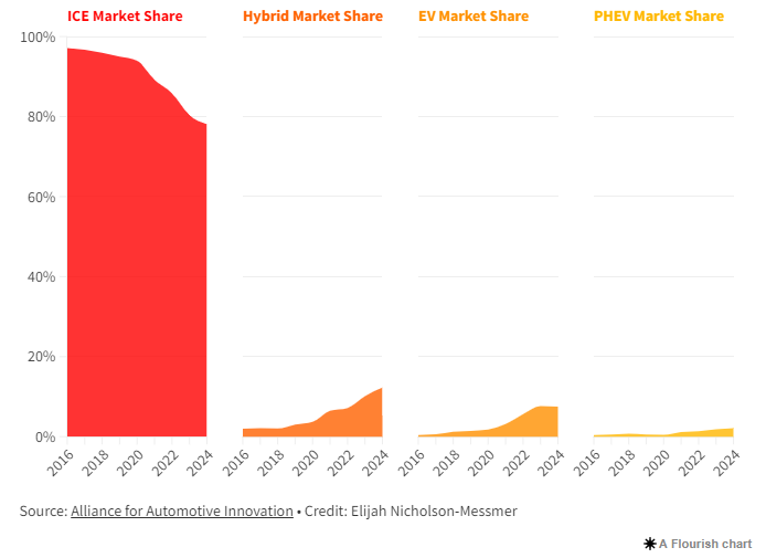 Менше ніж десять років тому автомобілі з ДВС становили близько 97% ринку США, але ця цифра зазнала істотних змін: зараз альтернативні варіанти займають вже чверть всіх продажів нових автомобілів. У 2024 році частка автомобілів з ДВС склала 78% — це на 18% менше, ніж до пандемії. Зростання популярності гібридів і електромобілів стало можливим завдяки розширенню пропозицій виробників і державним пільгам.