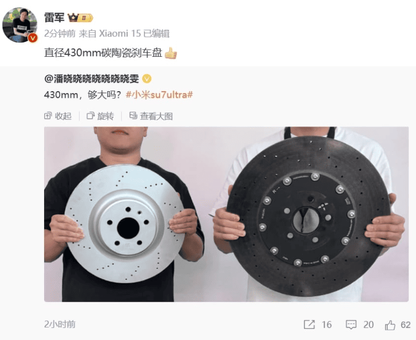 За словами Лея, SU7 Ultra отримала карбон-керамічні гальмівні диски, які забезпечують вражаючі характеристики гальмування. Передній диск має діаметр 430 мм, а задній — 410 мм. Ці гальма здатні витримувати температури до 1300°C, що робить їх ідеальними для високопродуктивного використання.