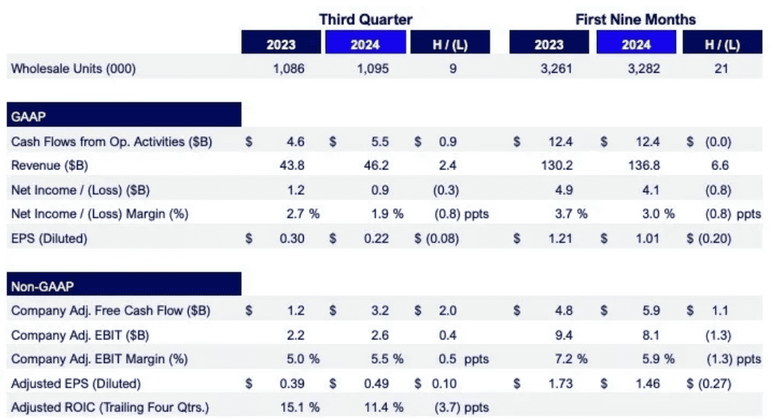 Електромобілі, зокрема Ford Model E, зазнали значних втрат, із падінням доходів на 33% в порівнянні з минулим роком, в той час як доходи від традиційних двигунів Ford Blue зросли на 3%. Попри ці виклики, Ford повідомила про зниження витрат і зростання продажів, а також анонсувала нові моделі, такі як оновлені Maverick і Bronco Sport.