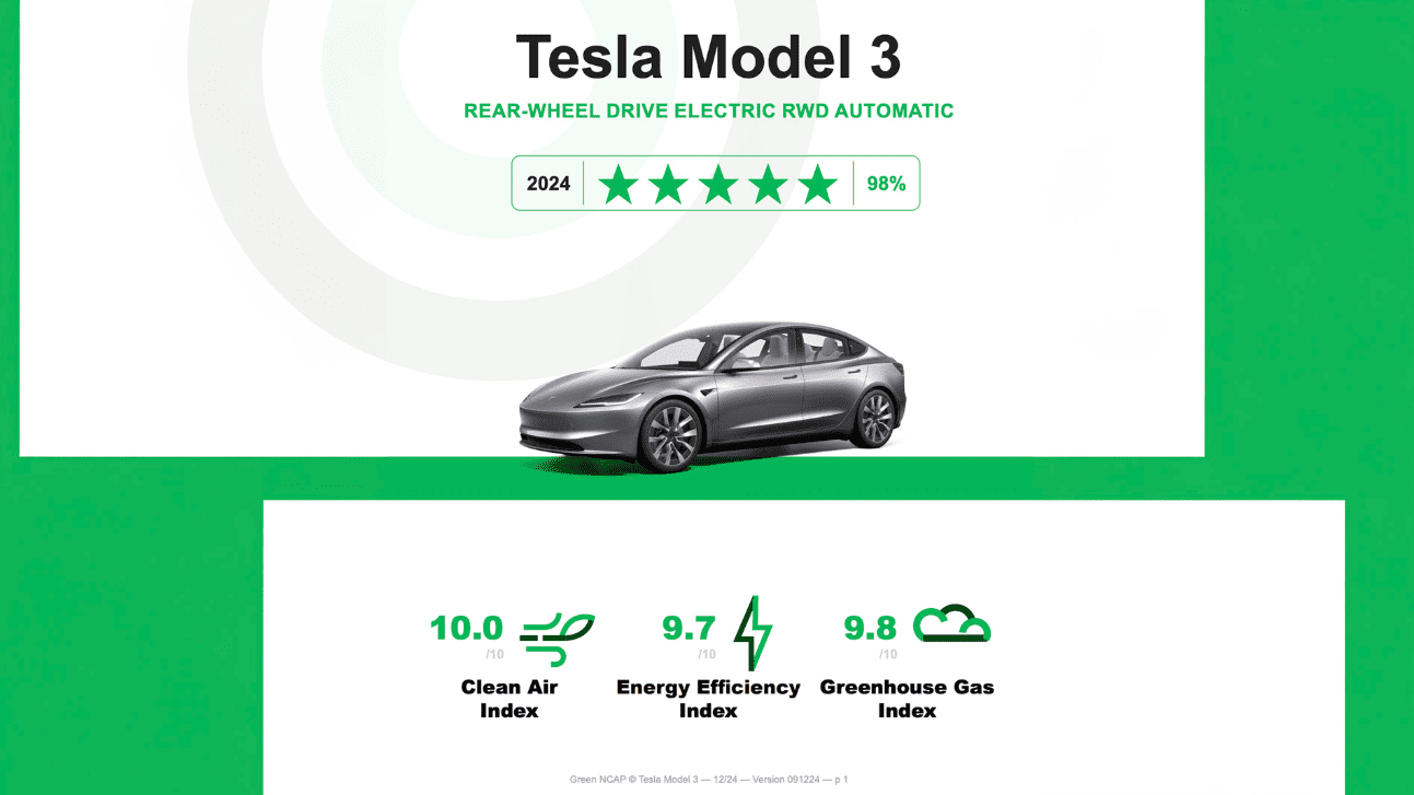 Tesla Model 3 з заднім приводом отримала загальну оцінку 98%, що зробило її однією з найбільш екологічних моделей на ринку, поступаючись лише Hyundai Kona EV 2024 року.