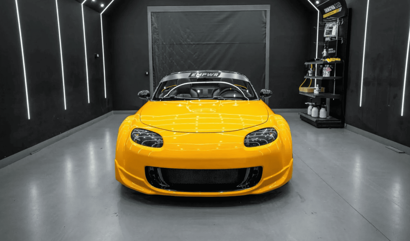 Основною особливістю цієї Mazda є нестандартний передній бампер в стилі Honda S2000, що надає авто більш сучасний вигляд. Окрім того, автомобіль оснащений спойлером з карбоновим оздобленням, червоними тонованими задніми ліхтарями та комплектом темних дисків Japan Racing JR5. На даху встановлений жорсткий дах з електроприводом, а в салоні зберігається стильний чорний інтер’єр з жовтими акцентами.
