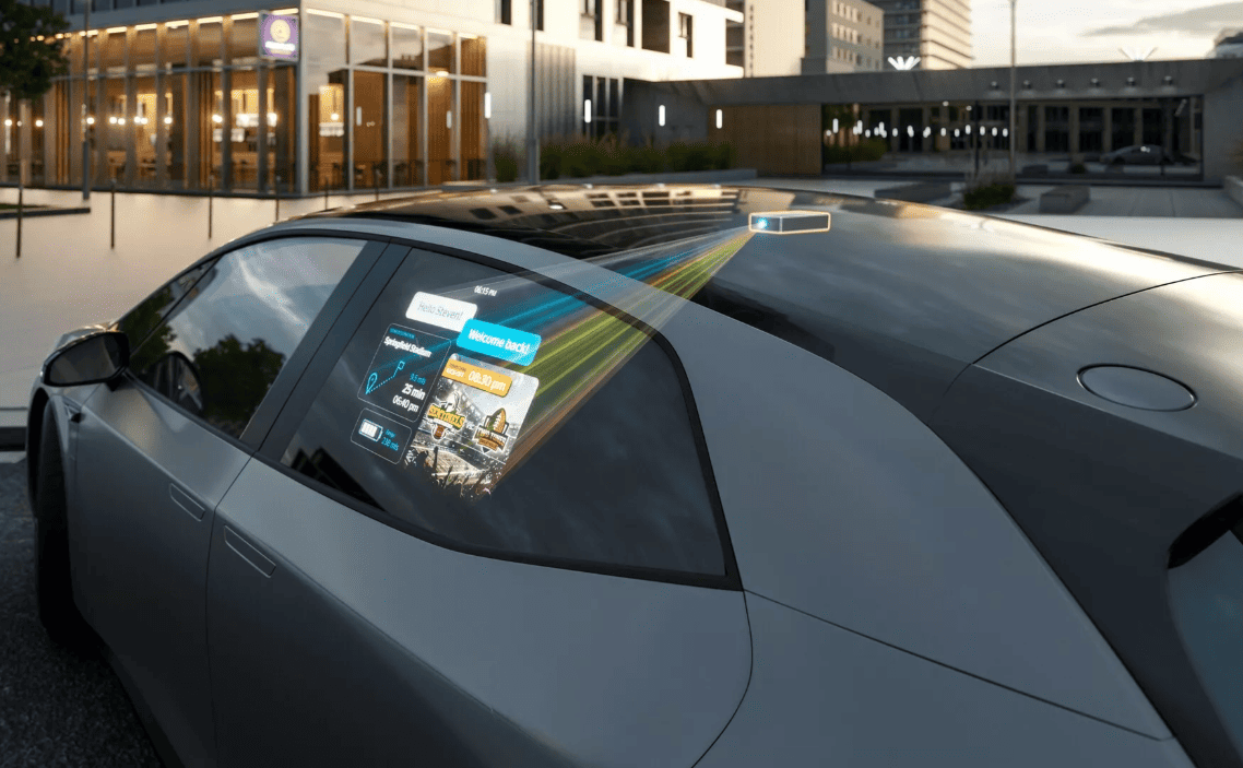 За допомогою цієї технології вікно автомобіля повністю затемнюється, після чого на ньому з’являється високоякісне зображення або графіка. Проектор здатен відображати контент з надзвичайно високою роздільною здатністю, який можна легко налаштувати під потреби користувача. Це може бути, наприклад, важлива інформація для пасажирів або навіть контент для людей поза автомобілем.