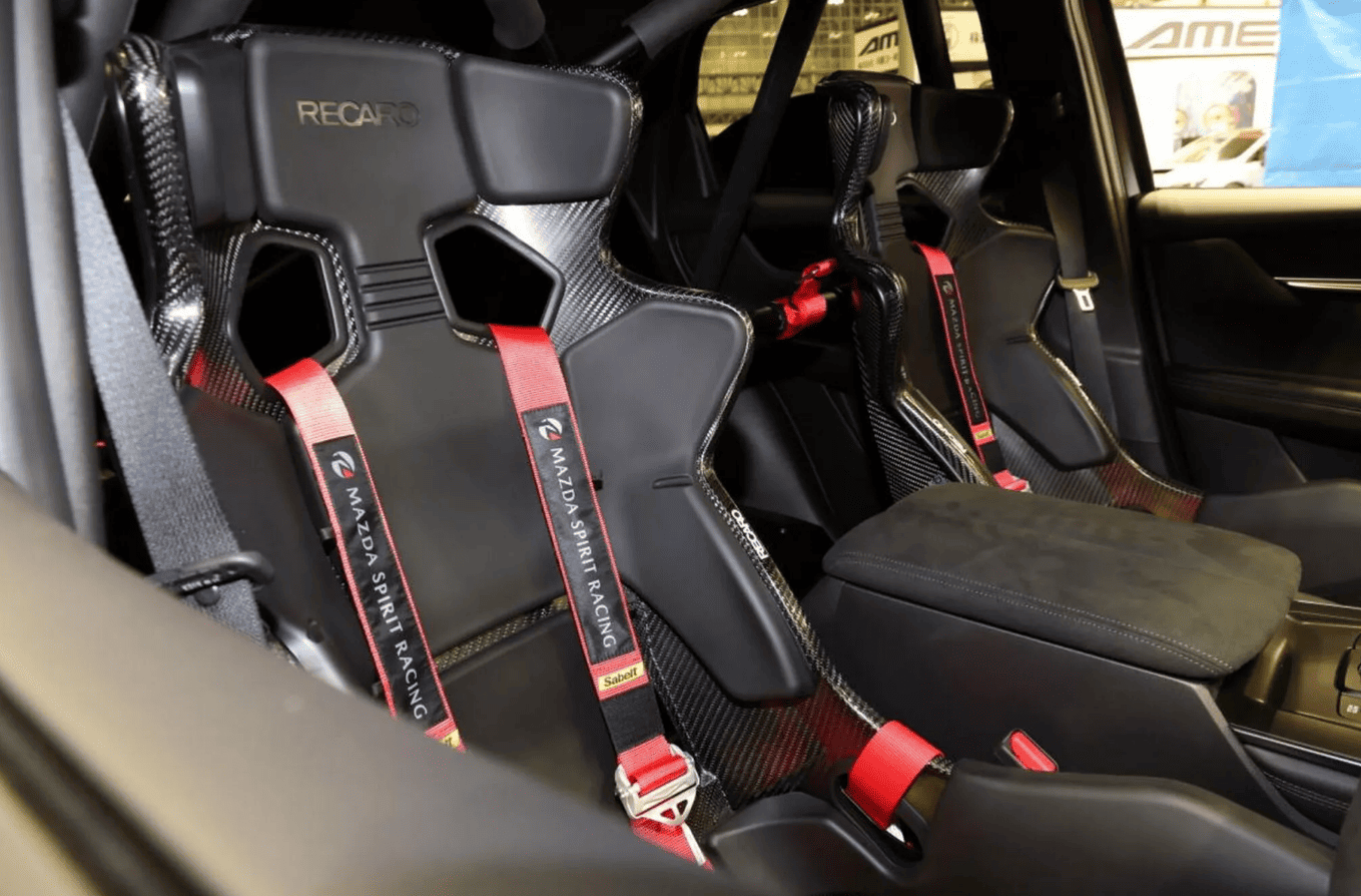 Інтер’єр CX-60 Rally також отримав спортивний акцент. Карбонові сидіння Recaro з шеститочковими ременями безпеки і каркас безпеки надають салону вигляду, який більше відповідає суперкару для трекових перегонів, ніж звичайному позашляховику. Для ще більшої динамічності в салоні використані вставки з алькантари та чорної шкіри.