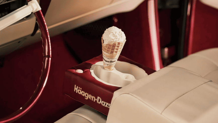 Розкішний стиль продовжується і в салоні. Кремові шкіряні сидіння поєднуються з бордовою панеллю приладів, а центральна консоль отримала спеціальний тримач для ріжків з морозивом. Дизайн доповнюють вишиті логотипи Häagen-Dazs і брендований кермо.
