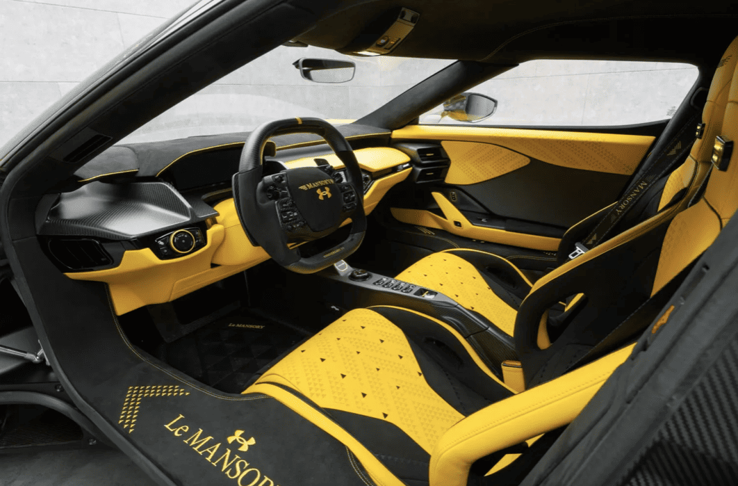 Салон автомобіля виконаний у тих самих жовто-чорних відтінках, що й екстер’єр, та оздоблений шкірою й алькантарою. Всередині також можна знайти логотипи Mansory та Under Armour.