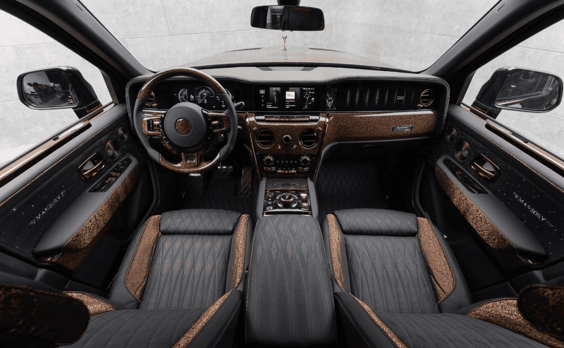 Інтер’єр автомобіля також не залишає байдужим — сидіння оббиті поєднанням коричневої та чорною шкірою з індивідуальними швами та підсвіченими логотипами Mansory, що підкреслює розкіш і ексклюзивність автомобіля.