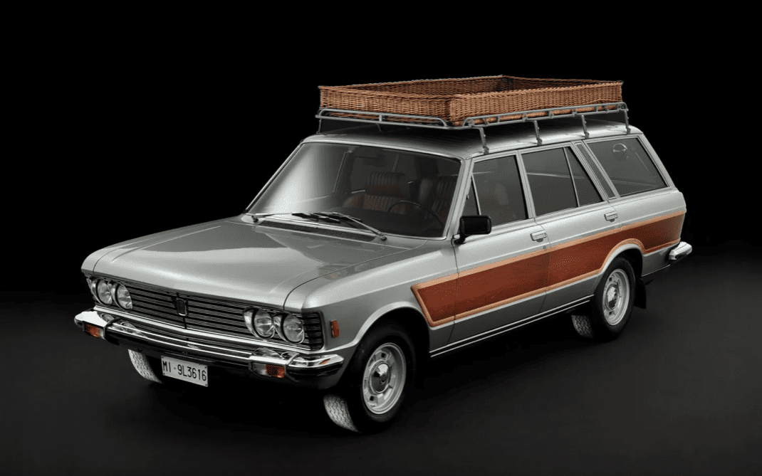 Другий – надзвичайно рідкісний Fiat 130 Familiare 1974 року. Це один із трьох екземплярів з декоративними вставками під дерево та плетеним кошиком на даху. Його оціночна вартість становить 170 000 – 300 000 євро.