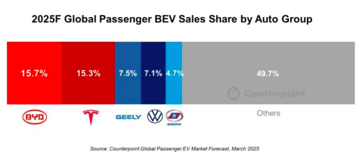— 03.04.2025 / 13:03Китайський автовиробник BYD другий квартал поспіль залишається найбільшим у світі виробником електромобілів, що свідчить про значний зсув у глобальній індустрії EV. За підрахунками Counterpoint Research, ця тенденція збережеться принаймні до 2025 року.