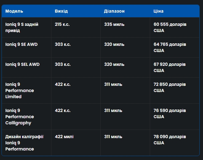 Три комплектації Performance мають потужність 422 к.с. і можуть проїхати до 311 миль на одному заряді. Коли Hyundai представила Ioniq 9, компанія заявила, що найшвидша версія розганятиметься до 60 миль на годину за 4,9 секунди.