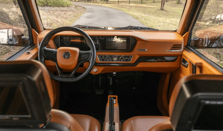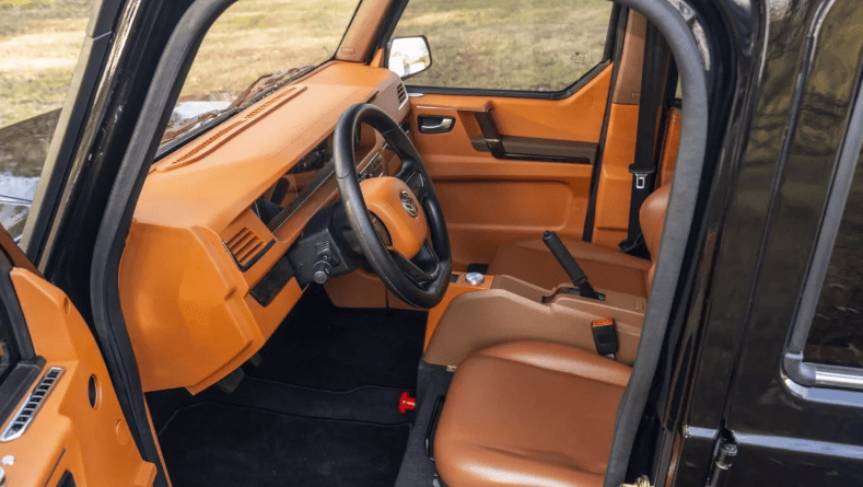 Усередині Bodo G-Wagon намагається імітувати розкіш по-своєму. Пластик кольору сідла на сидіннях здалеку трохи нагадує шкіру, але зблизька зрозуміло, що ви сидите в чомусь, що більше схоже на іграшкову машинку, ніж на розкішний позашляховик. В описі стверджується, що він оснащений «зручностями повнорозмірного автомобіля», якщо вважати до функцій вищого рівня такі речі, як повністю цифрова кабіна, задні екрани для пасажирів, кондиціонер і камера заднього виду.