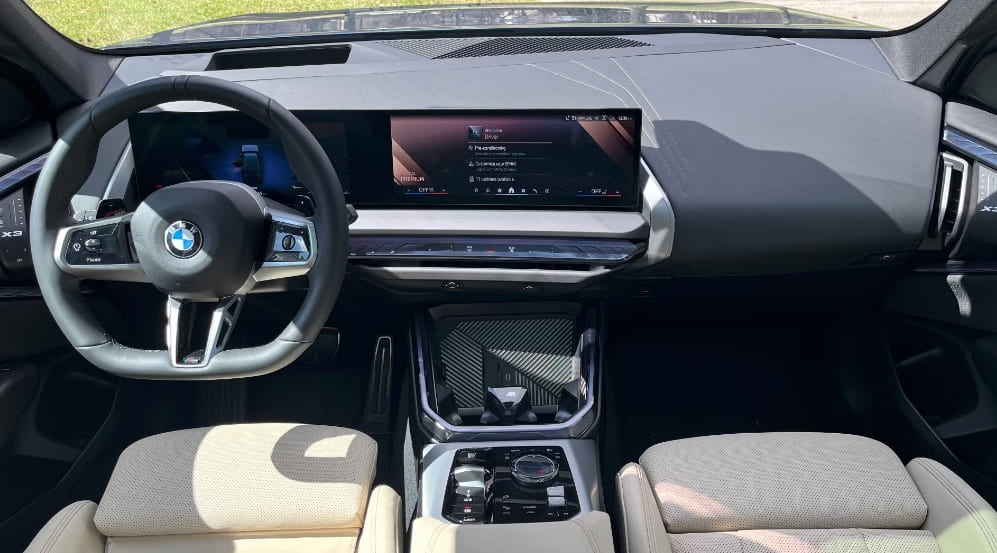 Як і екстер’єр, X3 має повністю модернізований інтер’єр BMW. Це означає, що він має різко нахилену приладову панель з парою подвійних екранів, розташованих у схилі. Приладова панель зазвичай пластикова, але доступні акценти з тканої тканини, щоб зробити її ще більш унікальною. Доступні дерев’яні або алюмінієві елементи, останній з яких входить до пакету M Sport. На жаль, застосування алюмінію та дерева мінімальне, тому більшість панелей приладової панелі та дверей пластикові, і це помітно. Налаштовувані підсвічування розташовані на дверях та центральній консолі. Це одні з найцікавіших застосувань атмосферного освітлення на ринку, оскільки димчасті прозорі поверхні мають фасетку, що робить їх майже схожими на коштовності, коли вони підсвічуються. Хоча, якщо ви вважаєте їх неприємними, їх можна повністю вимкнути. Пакет M Sport також додає кермо з плоским дном. Воно виглядає спортивно, але також досить товсте і не найзручніше в руках.