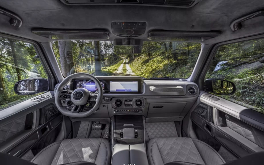 Серед інших особливостей — передній “кенгурятник”, вихлопи з боків, висувні підніжки та безліч логотипів Brabus, що розкидані по кузову. Автомобіль стоїть на нових 22-дюймових дисках Brabus Monoblock Z/HD, обутими в позашляхову гуму Pirelli Scorpion. Цікаво, що на відміну від більшості G-Class, запаски на дверях багажника немає — натяк на те, що цей G створений не для стандартів, а для шоу.