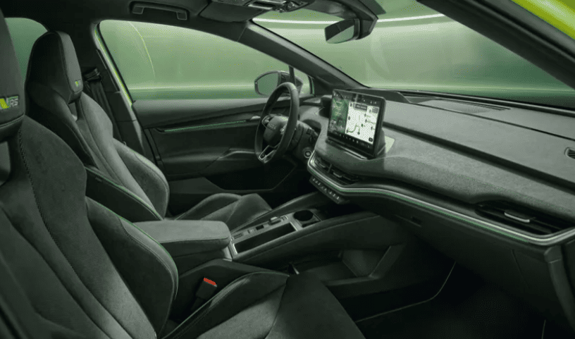 Як і годиться автомобілям у виконанні vRS, новинка отримала безліч глянцево-чорних акцентів на дрібних деталях — рейлінги на даху, окантовка вікон і корпуси дзеркал. Вони чудово доповнюють сучасне обличчя Enyaq під назвою «Tech-Deck», за яким ховається ціла армія радарів і датчиків. Усе це потрібно для систем адаптивного круїз-контролю, асистента в заторах та іншого подібного функціоналу.