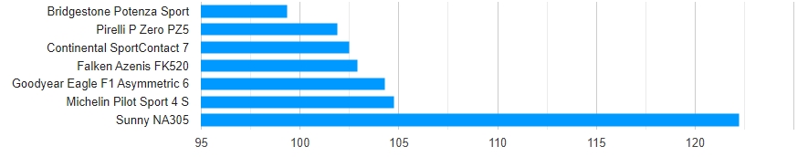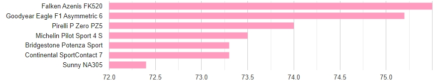 Найтихішою шиною у тесті виявилася Goodyear, дуже близько за нею йде Falken. Далі непогано показали себе Pirelli та Continental, Bridgestone — на прийнятному рівні, а Michelin і Sunny були приблизно на 2 дБ голоснішими за Goodyear. Це незначна різниця, особливо враховуючи, що вимірювання проводилось зовнішнім мікрофоном. У салоні машини я жодних відмінностей не помітив.