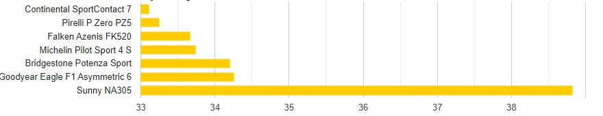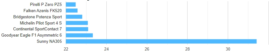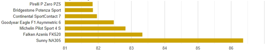 Усі шини, крім Sunny, показали відмінні результати у гальмуванні на мокрому покритті — з будь-якою з них ви залишитесь задоволені. Pirelli вийшла на перше місце, але різниця між шістьма лідерами склала лише 3,8%, що свідчить про надзвичайно щільну конкуренцію.