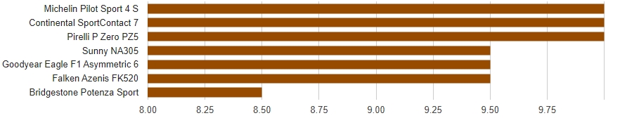 Останні три шини — Continental SportContact 7, Bridgestone Potenza Sport та Pirelli P Zero PZ5 — стали найкращими у тесті, всі чудові, але з тонкими відмінностями. Continental демонструє величезне зчеплення і точне кермування в сублімітних режимах, але трохи поступається у стабільності при агресивному вході в повороти. Bridgestone має неймовірне зчеплення та швидку реакцію керма, але трохи слабкіше відчуття на вході та в середині повороту під час плавного керування газом, щоб «завалити» ніс автомобіля. Pirelli відчувається трохи легшою в кермі на субліміті, але в повороті вона чудово «вгризається» в асфальт з передбачуваною та приємною поведінкою.