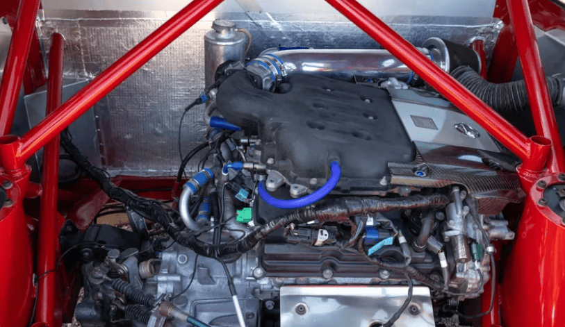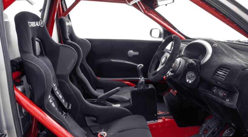 Це тому, що в Micra 350SR прибрали задні сидіння й буквально “впхнули” 3,5-літровий V6 від Nissan Murano просто в салон. До двигуна додали колектори від 350Z, розподільчі вали високого підйому та впуск NISMO, а також перепрошиту ECU — усе разом дало приблизно 300 к.с.