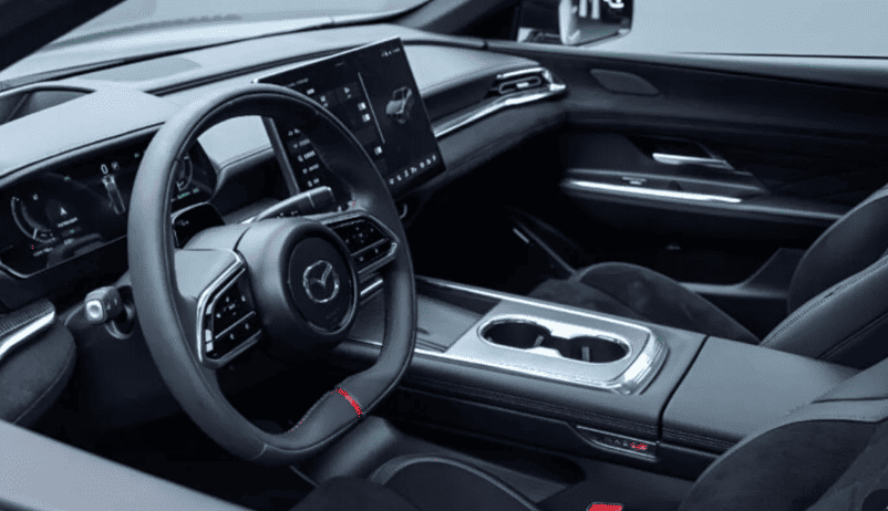 Всередині спортивна атмосфера підтримується оздобленням з Алькантари, червоними акцентами на сидіннях і контрастним стебнуванням. Додатковий шар стилю забезпечує червоне підсвічування елементів інтер’єру та декоративна вставка з текстурою «під сітку» на центральній консолі — така ж, як у спортивних версіях Mazda CX-60.