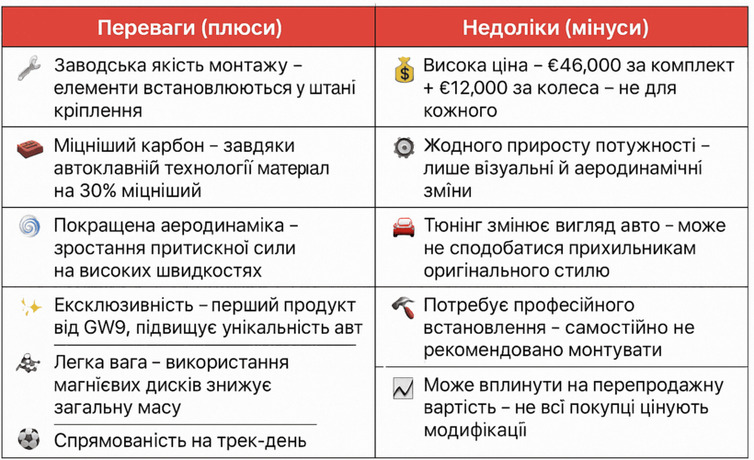 Таблиця з плюсами та мінусами нового карбонового обвісу для Porsche 911 Turbo S