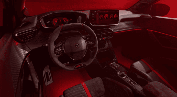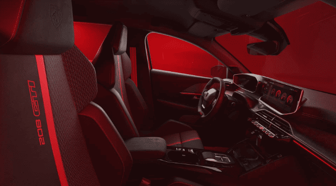 Новий Peugeot E-208 GTi має ексклюзивний яскраво-червоний колір кузова — данину класичному червоному відтінку, який був дуже популярним у першої 205 GTi. Спортивну атмосферу підкреслюють яскраво-червона підлога, килимки та ремені безпеки всередині салону. Ці деталі роблять інтер’єр живим та енергійним.