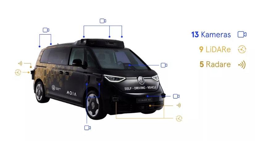 Головна новина — це, звісно, автономна система водіння. За словами MOIA, фургон оснащено 27 сенсорами. Серед них — 13 камер, 9 лідарів та 5 радарів.