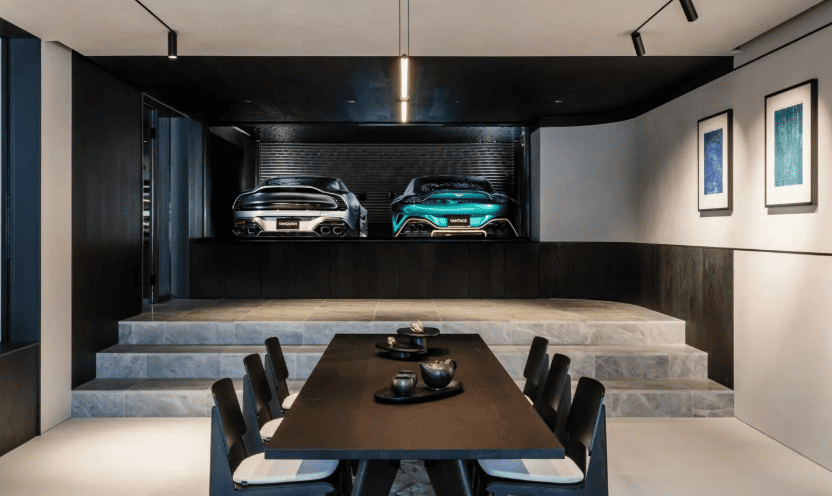 Хоча Aston Martin славиться своїми спортивними автомобілями, у самому будинку автомобільна тематика майже не відчувається. Єдине нагадування — дві моделі Aston Martin у гаражі. Втім, фасад будівлі вражає — він оздоблений металевими жалюзями, що створює стильний та сучасний вигляд.