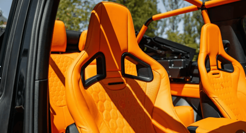 Задні сидіння перетягнуті яскравою шкірою кольору Hermes Orange. Спереду встановлені спортивні сидіння Recaro з карбоновими спинками, теж оббиті шкірою цього ж кольору. Це додає салону дорогого та ексклюзивного вигляду.