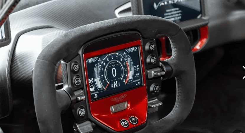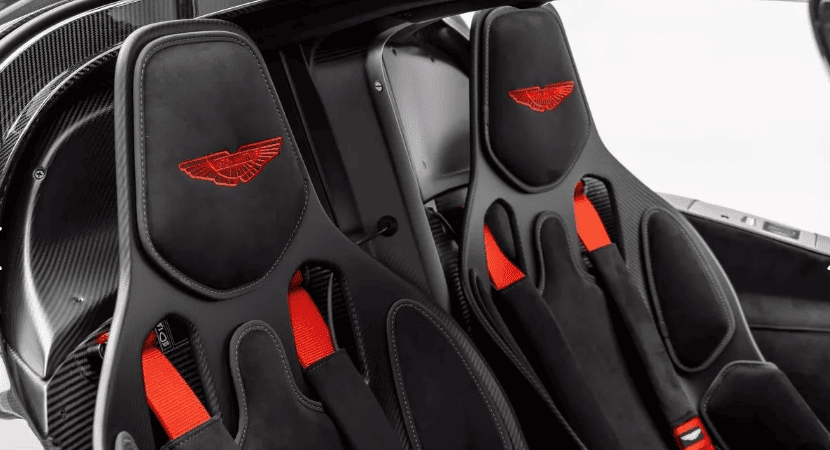 Салон повністю підтримує зовнішній образ: червоні перегонові ремені, вентиляційні отвори з червоною окантовкою, червоні деталі на кермі та логотипи Aston Martin на підголівниках, виконані в тому ж кольорі.