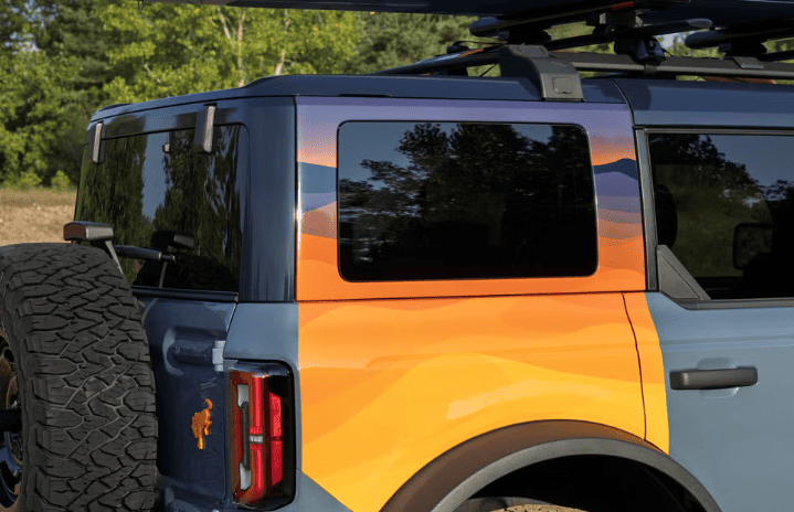 Двоколірна графіка «заходу сонця над озером» та фірмові емблеми у Bronco Silver Lake Dunes зроблені на замовлення. Теоретично будь-яка майстерня з виготовлення вивісок може створити щось схоже.