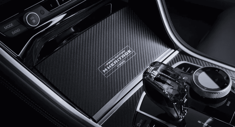 Сидіння M Sport оздоблені чорною шкірою BMW Individual Full Merino та алькантарою. Багато алькантари по салону. Контрастний М-шов підкреслює стиль. Центральна консоль — з матового карбону. На накладках порогів і кришках підсклянників — гравіювання “M850i Edition M Heritage” і “1/500”.