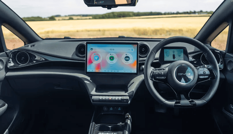 BYD Dolphin пропонує більше місця для задніх пасажирів і багажу. Його сенсорний екран вражає якістю та швидкістю роботи, але «обертовий» екран здається скоріше дизайнерським трюком.