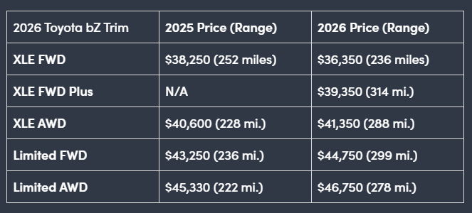 Базова версія Toyota bZ 2026 року XLE з переднім приводом та батареєю 57,7 кВт-год коштує $34 900 – на $2 170 дешевше за попередню модель bZ4x. Ця батарея забезпечує запас ходу близько 236 миль.