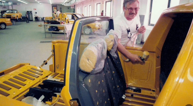 Передня частина натхненна концептом Vision 7S 2022 року. Тут ми бачимо вузькі LED-фари, закриту решітку та захисну накладку. Профіль прикрашають масивні колісні арки з чорним пластиковим обрамленням, що контрастує з яскраво-жовтим кузовом. А рожеві акценти та світлодіодна смуга задніх ліхтарів створюють справжню атмосферу пляжних 90-х.