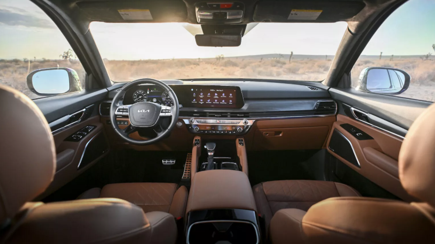 Салон став ще сучаснішим та зручнішим. Дев’ять місць, простора центральна консоль, сидіння з електрорегулюванням і масажем, а також можливість замінити другий ряд на «капітанські» крісла. Панель приладів — цифрова, з новітньою системою Kia та сервісами Google, включно з голосовим асистентом і цифровим ключем. Авто навіть може живити зовнішні пристрої завдяки функції V2L.
