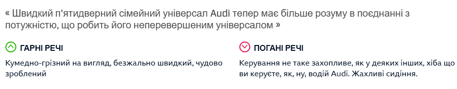 RS6 не слухняний, як M5 Touring – він не виконує всі команди водія. Але як RS6 він просто фантастичний, особливо у GT-версії. Є нюанси: педаль гальма надто чутлива – доводиться «літати носом у торпеду», а перемикання передач трохи повільне.