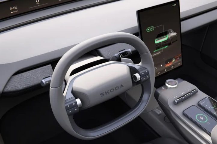 Під ним — кнопки кондиціонера, магнітна зарядка для телефонів та ротаційна ручка для управління. Skoda обіцяє, що ваші телефони не полетять під передні сидіння на першому повороті.