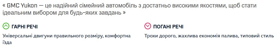 Головні конкуренти – Tahoe та Escalade: Yukon дорожчий за перший, але менш пафосний за другий. У підсумку, комфорт, простір і потужні мотори роблять його відмінним вибором. Єдиний мінус – доведеться частіше заправляти бак.