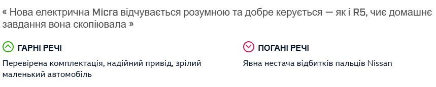 Micra – це ніби гарна кава без цукру: якісно, але емоцій не вистачає. Авто їде добре, заряджається швидко, виглядає сучасно. Але характеру – нуль.