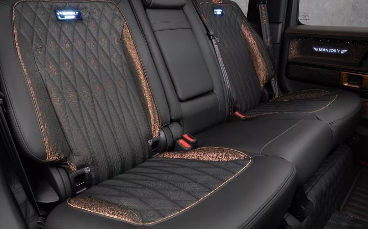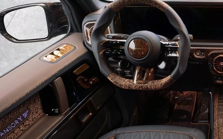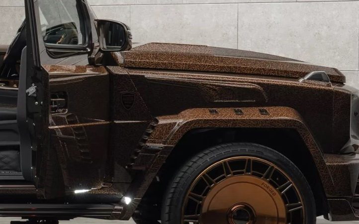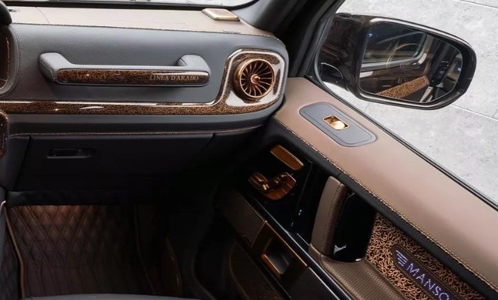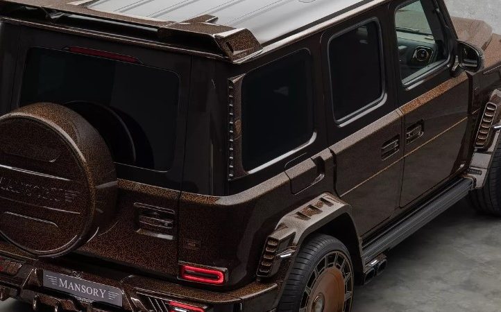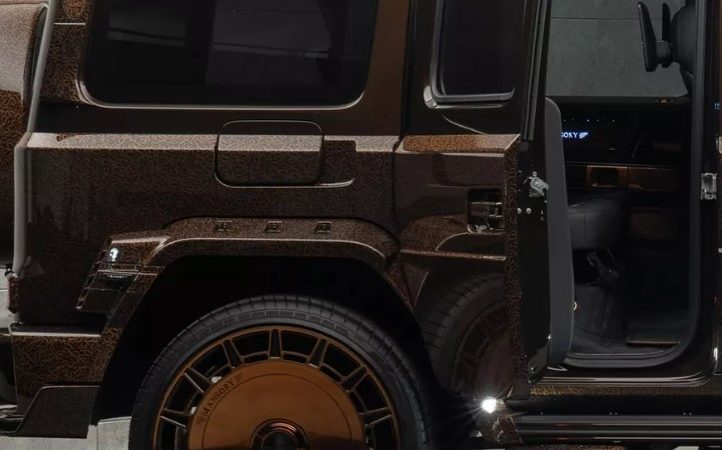 Збоку — розширені колісні арки, що підкреслюють міць позашляховика, висувні підніжки та екстравагантні бронзові колеса. Ззаду — величезний даховий спойлер, новий дифузор, додаткові задні ліхтарі та навіть унікальний кожух запасного колеса. І головний сюрприз: двері типу «суїцид», які відкриваються проти руху — рішення, що додає G-Class елегантності Rolls-Royce.