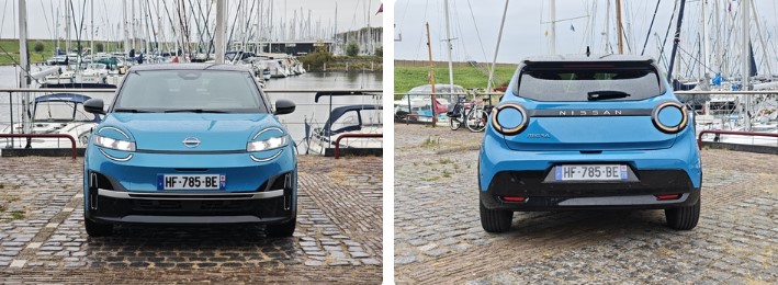 Спереду Micra виглядає більш округлою, ніж Renault 5. Фари овальні, горизонтально розташовані, LED-оптика зі світловим кругом-поворотником, а масивний сірий бампер робить авто низьким і впевненим.