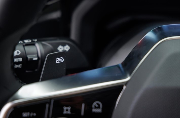 Фізичні кнопки клімату під рукою, індукційна зарядка в центральній консолі. Рекуперація енергії керується підкермовими «пелюстками» у 4 режимах, включно з режимом «One Pedal». Мінус: три важелі поруч із кермом можуть плутати водія.