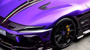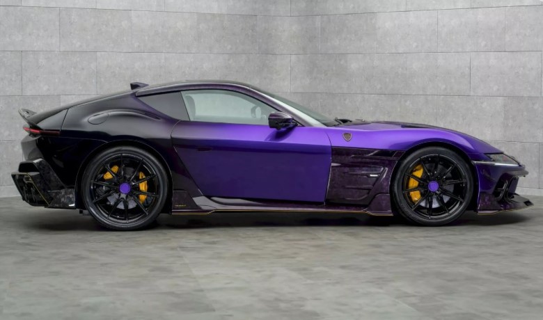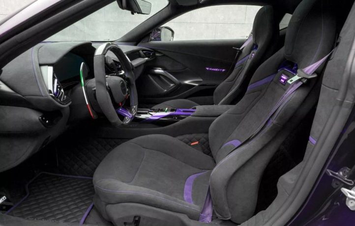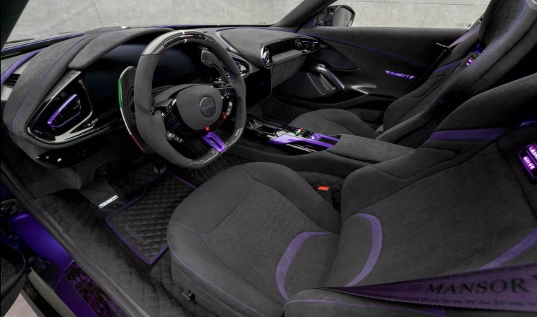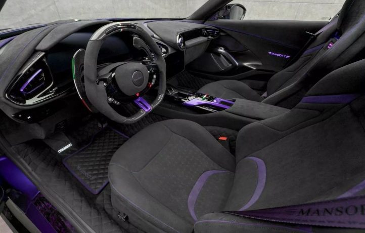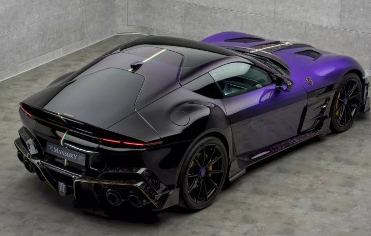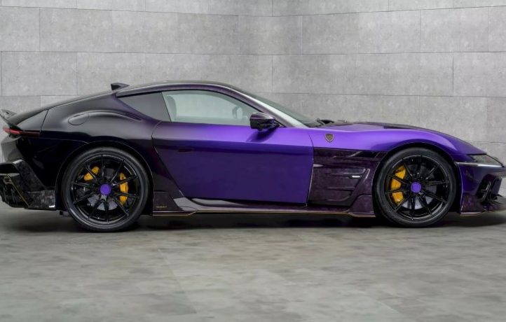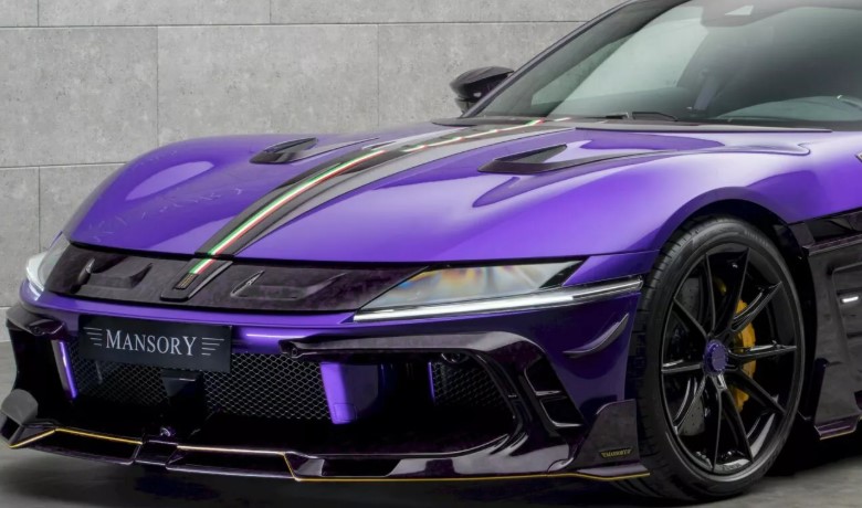 Найбільше дивує зовнішність. Усі фірмові емблеми Ferrari зникли – і це лише початок. Кузов прикрашений фірмовими деталями Mansory з кованого карбону у незвичному фіолетовому відтінку. Решта поверхні – поєднання чорного та фіолетового з золотими акцентами. Авто виглядає, наче суперкар із майбутнього, що потрапив у сьогодення.