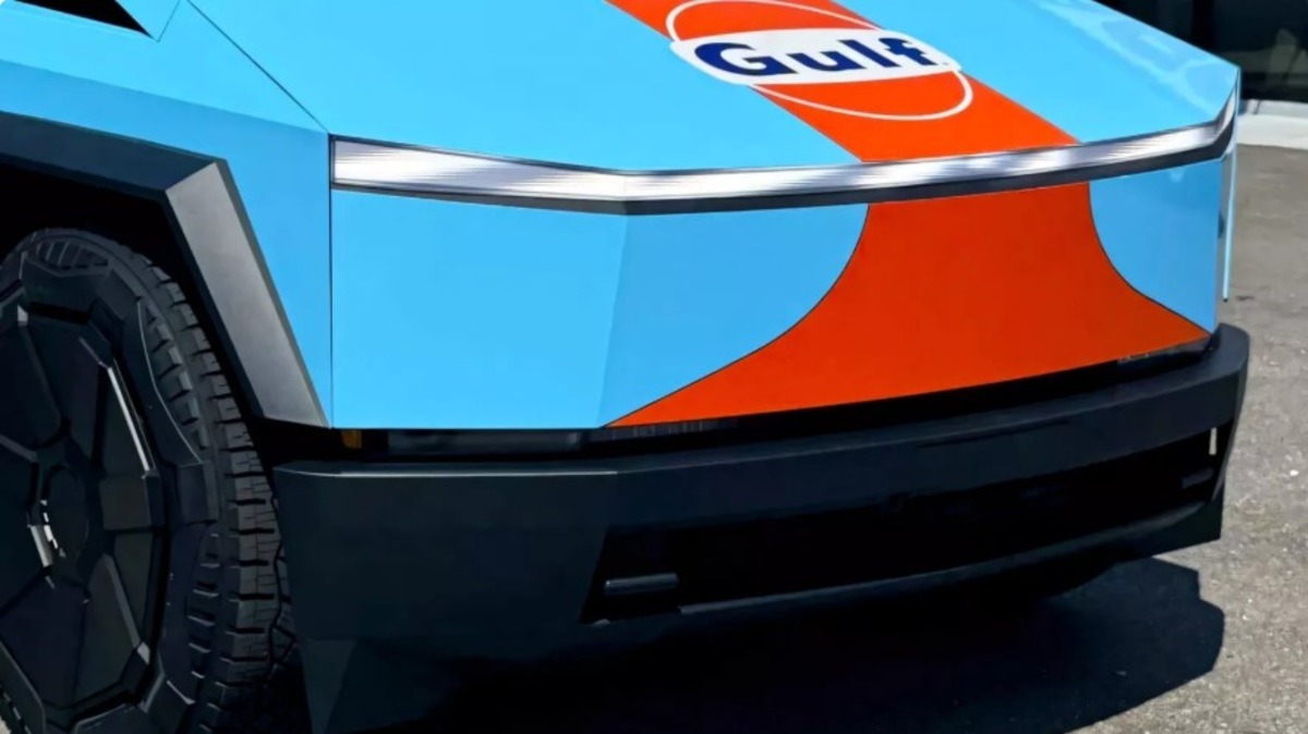Перше, що впадає в очі — обклеювання в культовому стилі Gulf Racing. Блакитно-оранжева гама десятиліттями прикрашала легенди автоспорту: McLaren F1 GTR, Porsche 917, Ford GT40. На суперкарах це виглядає ефектно, але на кутастому Cybertruck такий образ виглядає чужорідним. А ще парадокс: Gulf — нафтова компанія, тож її лого на електропікапі виглядає так само дивно, як реклама стейкхаусу на веганському фестивалі.