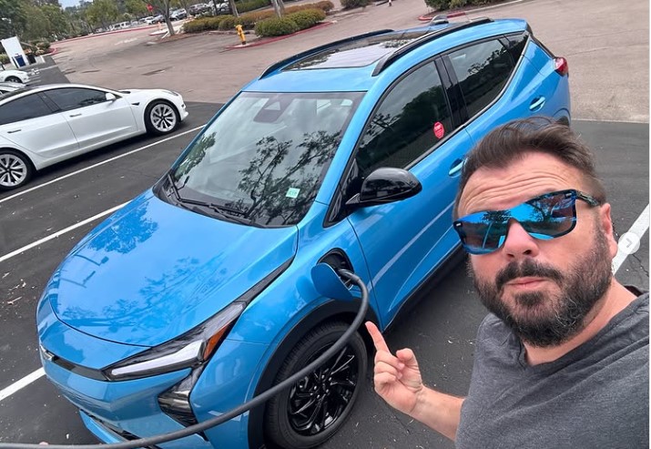 На знімках Bolt EUV сяє у стильному відтінку металік-синього та заряджається на станції Tesla Supercharger.