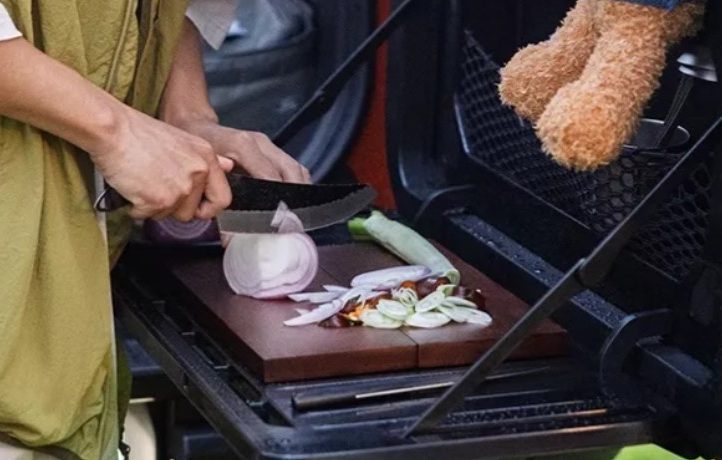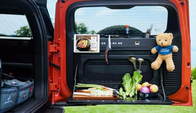 І це ще не все. Тема подорожей продовжується ззаду: Bronco Basecamp отримав так звану «гірську кухню» на кришці багажника. Це складаний столик, магнітна смуга для ножів та приладів, підсклянник і навіть вбудована відкоркувачка для пляшок. Усе продумано для того, щоб зупинка на природі перетворилася на справжнє свято.