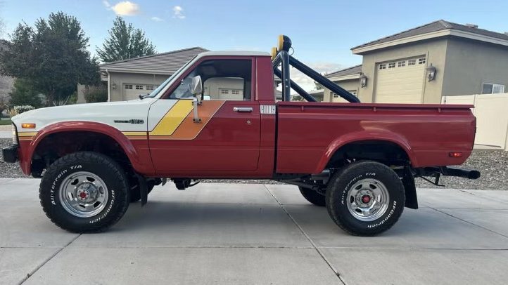 А ось Toyota 4×4 1981 року — зовсім інша історія. Вона з минулого, але має те, чого бракує сучасним авто: душу. Повністю відреставрована, з блискучою фарбою, культовими смужками на кузові та прожекторами KC HiLiTES зі «смайликами» — ця Toyota виглядає так, ніби щойно зійшла з конвеєра 80-х.