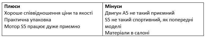 A5 та S5 чудові за безпекою, комфортом та економічністю – до 36 mpg на трасі в A5. Вони стильні, технологічні та практичні. Але дизайн і внутрішня інженерія не дивують: нові моделі сильно схожі на старі, а сенсорні панелі на дверях іноді дратують.